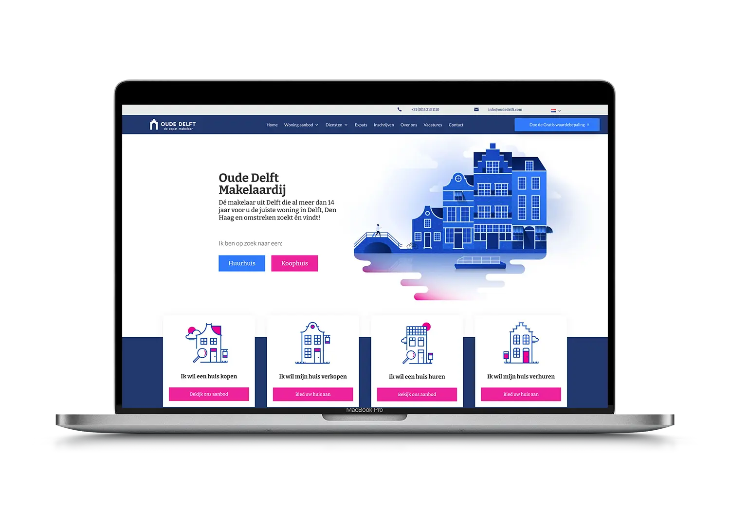 Oude Delft Makelaardij is een vastgoedbedrijf in Delft dat al meer dan 14 jaar woningen verkoopt, verhuurt en beheert. Ze richten zich op zowel lokale als internationale klanten, waaronder expats, en bieden diensten aan zoals waardebepalingen en investeringsadvies. De website hebben we met de kleuren van Delft overzichtelijk gemaakt met de nieuwste woningen aangeboden.