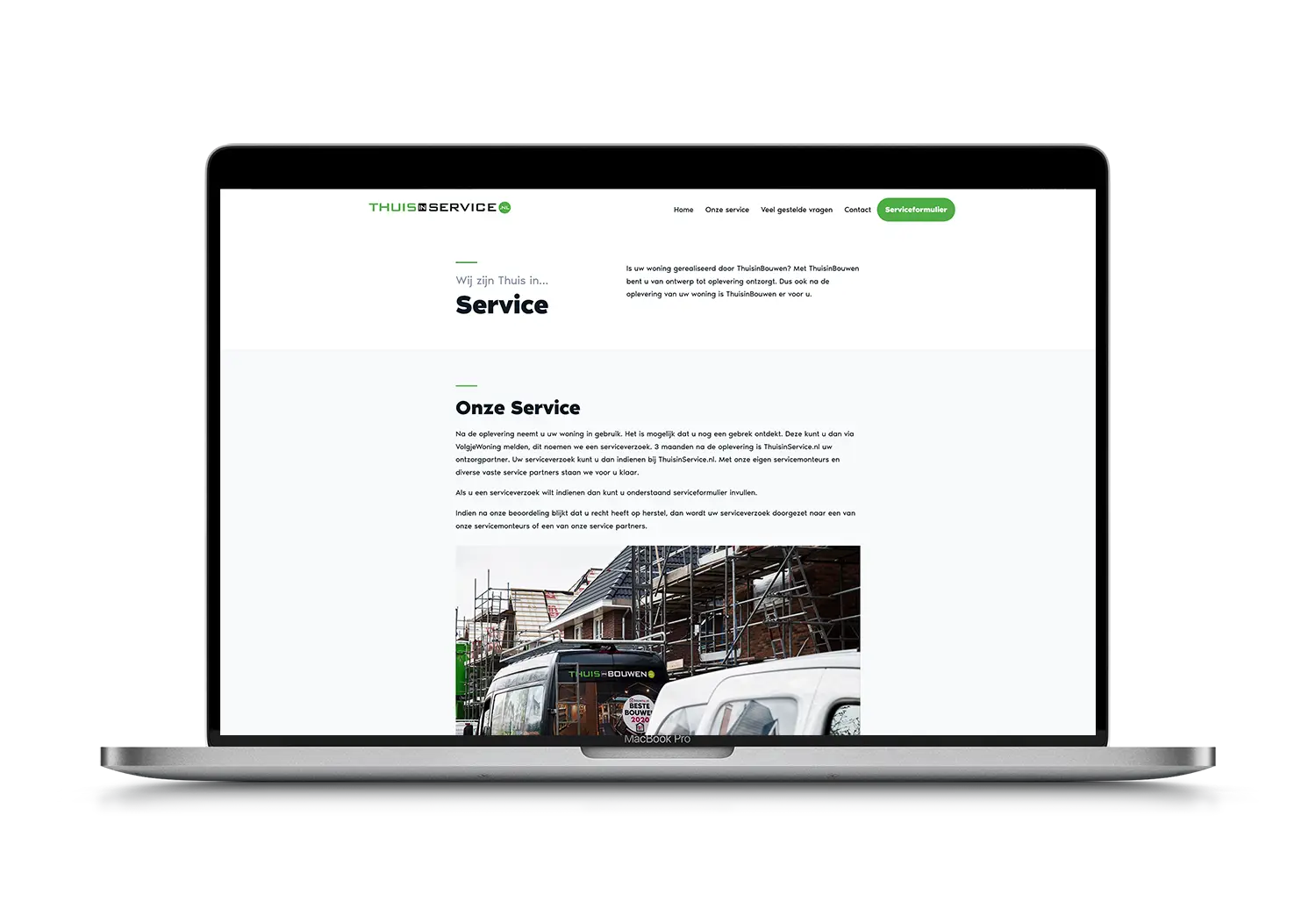 Naast ThuisinBouwen hebben wij ook de website voor ThuisinService ontwikkeld. ThuisinService.nl biedt service en ondersteuning aan huiseigenaren wiens woning door ThuisinBouwen is gerealiseerd. De website bevat een sectie met veelgestelde vragen en stelt bezoekers in staat om hun serviceverzoek eenvoudig in te dienen via een serviceformulier.